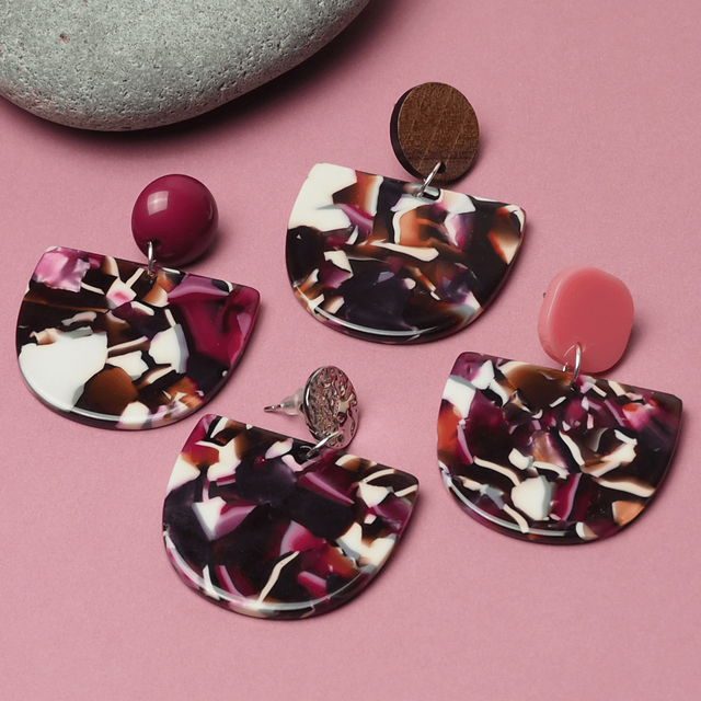 Boucles d'oreilles en résine, effet écailles: violet-blanc-marron-rose