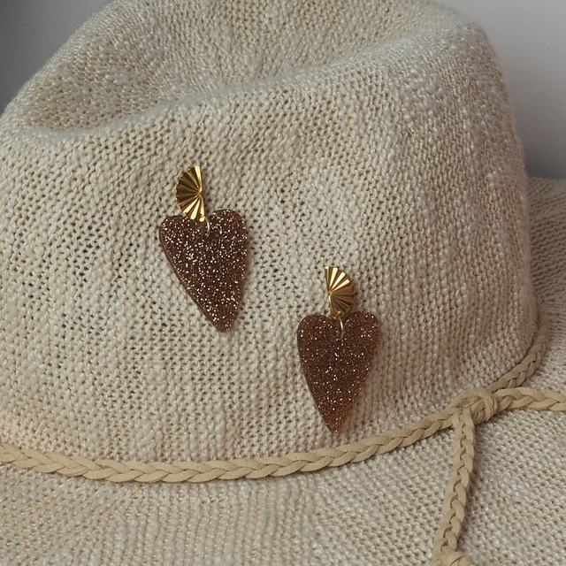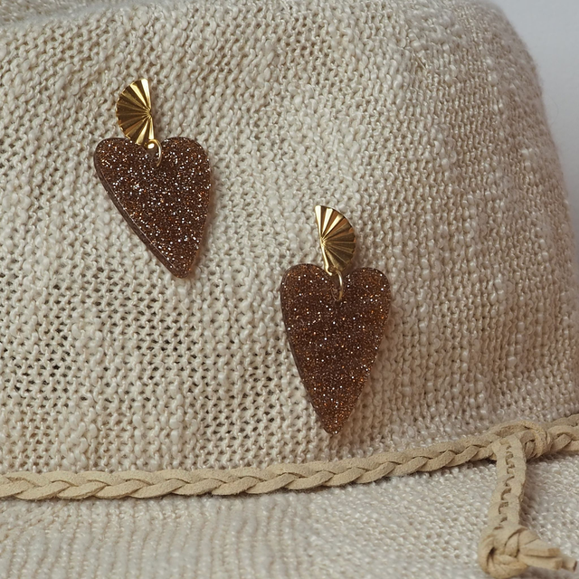 Boucles d'oreilles cœurs à paillettes bronzes: matière acrylique.